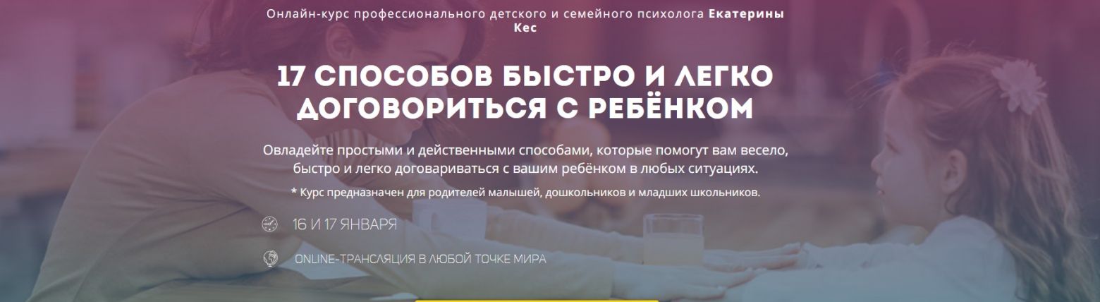Всего лишь за 2 занятия вы овладеете простыми и действенными способами легко, быстро и весело договариваться с ребёнком в любых ежедневных ситуациях.