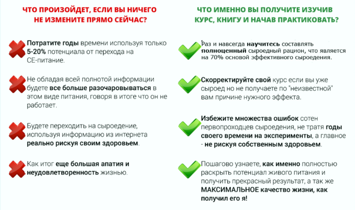 Вы получаете инструменты, эффективность которых я многократно проверил и опробовал на себе и своих последователях. Ежедневно с 2010г. я изучаю тему сыроедения и реализовал в данном курсе все самое лучшее. Результат - максимальный уровень энергии за всю жизнь и анализы в абсолютной норме.