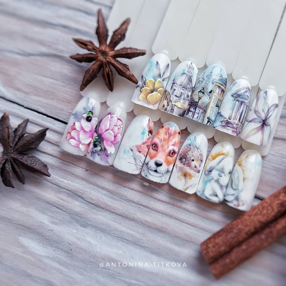 Осенние зарисовки смотрятся особенно красиво в акварельной технике. Для этих дизайнов вам не понадобится акварель и вода. Будем рисовать гель лаками.