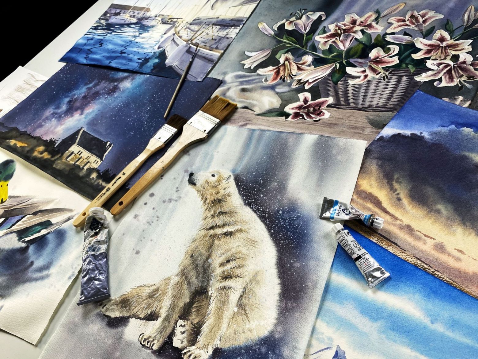 Вы научитесь находить лучшую композицию и подбирать оптимальные приемы и техники под разные художественные задачи, будь то изображение пушистого белого медведя, моря в закатных лучах или многофигурного натюрморта. Вы будете писать по-сухому и по-мокрому, использовать белую краску, салфетки, марлю и воду, научитесь передавать любые фактуры и показывать даже сложное освещение реалистично. Курс составлен так, чтобы вы постепенно, от простого к сложному, изучили все акварельные премудрости и смогли взяться за любой сюжет после его прохождения.