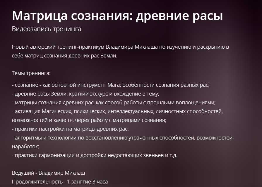 Новый авторский тренинг-практикум Владимира Миклаша по изучению и раскрытию в себе матриц сознания древних рас Земли.