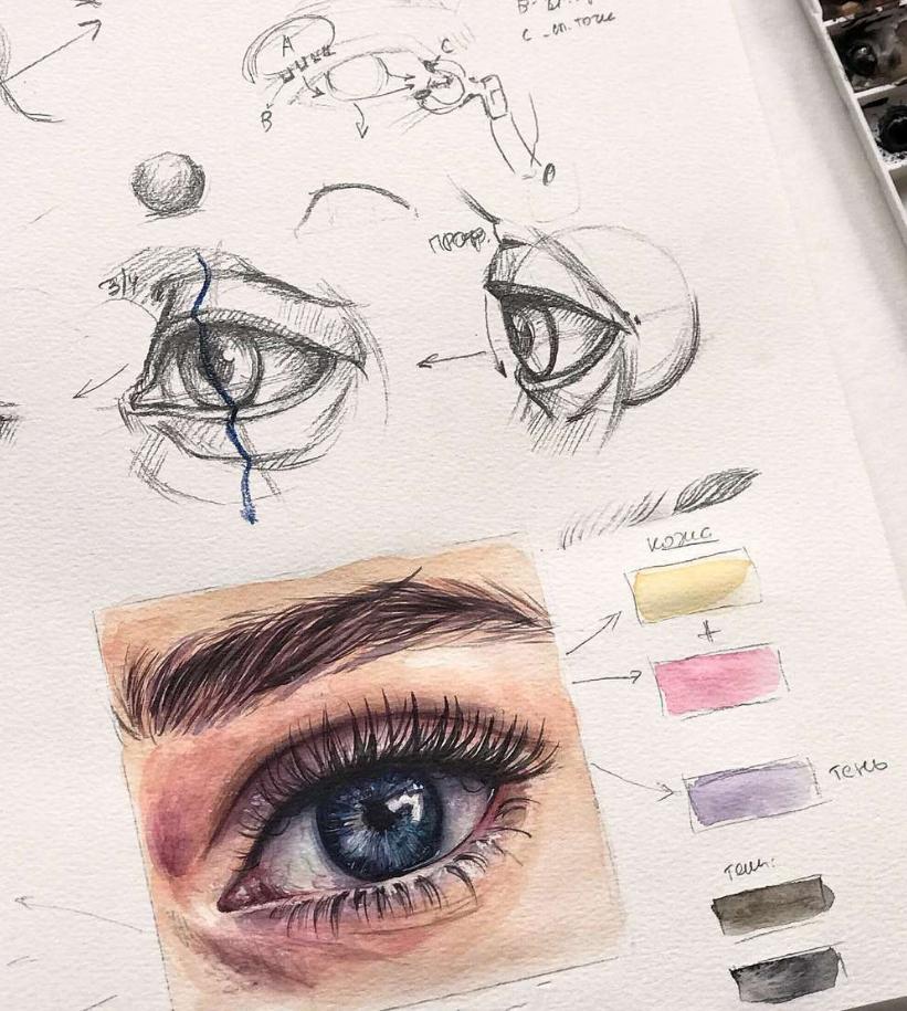 После переходим к итоговой работе. С нуля рисуем карандашом глаз, штрихуем, обозначаем светотень. Далее работаем с акварелью. Рассказываю информацию по цветам, смешиваем нужные оттенки и шаг за шагом добиваемся реалистичности в работе.