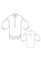 Блузка женская увеличенного объема, прямого силуэта, длиной ниже линии бедер. Спинка с плечевой кокеткой и встречной наклонной складкой по центру. Перед с удлиненной планкой с втачными концами по типу «поло», без застежки, но при желании можно оформить петли/пуговицы на планке. Воротник стояче-отложной с отрезной стойкой. Линия проймы спущена. Рукав укороченный, сложной формы, объемный со складками по окату и сборкой на резинку по низу.