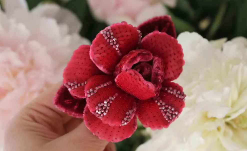 Мастер класс включает в себя: вышивка пайетками иглой по шелковой органзе на пяльцах, обработка изнанки вышивки, создание гибкого каркаса, термообработка изнанки бархатом, сборка и формирование цветка в брошь.