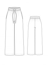 Брюки женские свободного покроя, слегка расклешенные книзу. Пояс притачной с тремя рядами кулис под эластичную тесьму и шнур. Карманы боковые с цельнокроеным бочком. Посадка на талии. Прибавка к обхвату колена около 28см.