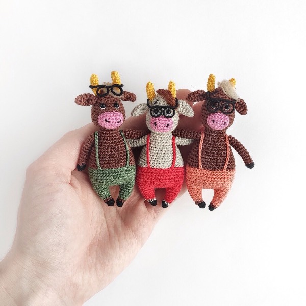 Универсальная и простая в вязании игрушка бычок, которую можно связать из любой пряжи, даже плюшевой. Размер будет зависит от выбранной пряжи: например, из Пеликан 8,5 см, итальянского тонкого велюра и джинса 14 см, himalaya dolphin baby - 35,5 см.