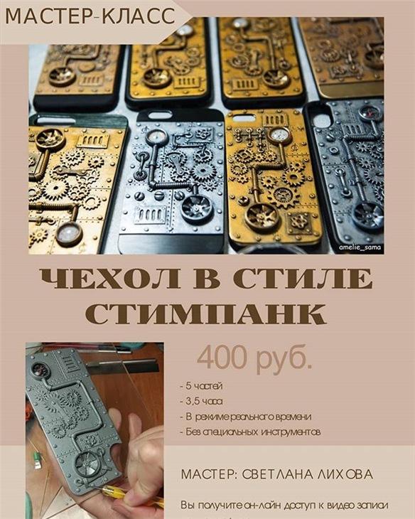 запись прямого эфира по декору чехла на телефон в стиле стимпанк полимерной глиной