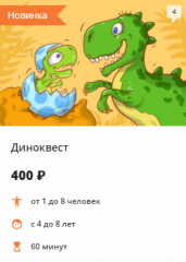 Это наш самый красочный квест, и он про динозавров! Детям предстоит отыскать 12 яиц, которые унёс ураган из гнезда ти-рексов. На пути они встретят много необычных динозавров и немало приключений.