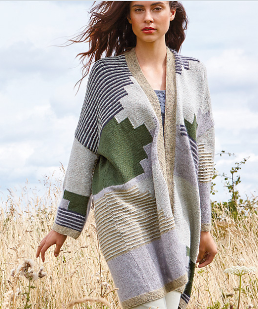 Объемный повседневный вязаный кардиган Nabeela выполнен платочной вязкой и крупными узорами из цветных блоков в технике интарсии. Для его выполнения используется пряжа Softyak DK, содержащая 76% хлопка, 15% шерсти яка и 9% нейлона, пряжа Felted Tweed, содержащая 50% шерсти, 25% альпаки, 25% вискоза, роскошная тонкая пряжа Kidsilk Haze, содержащая 70% мохера, 30% натурального шелка, и пряжа Fine Lace, смесь из 80% альпаки и 20% шерсти.