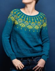 Вязаный пуловер Босвелья с круглой кокеткой выполняется сверху вниз без швов. Свободная помадка и мотив цветного узора на кокетке делают его универсальной вещью для любого гардероба.