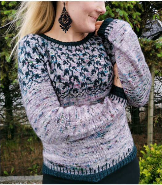 Пуловер связанный из тонкой пряжи с романтичным названием «Сияние листвы» можно носить круглый год. Его можно надеть под теплое пальто или поверх тонкой блузки и гольфа. Кокетка пуловера украшена изящным узором из листьев. Модель представлена в двух вариантах – с коротким рукавом и с длинным рукавом реглан. Пуловер вяжется от круглого выреза горловины без швов сверху вниз по кругу и отлично садится по плечам, не требуя выкройки.