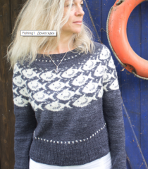 Свободный вязаный свитер FishingForCompliments имеет укороченную длину и глубокую круглую кокетку с узором из рыбок. Описание составлено для семи размеров и даны две версии длины рукавов - короткие и длинные.