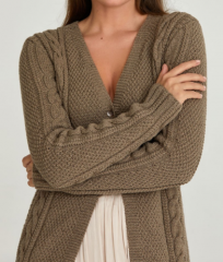 Вязаный женский кардиган Hessian удлиненного силуэта с острым вырезом горловины выполнен узором из кос и перекрученных петель на фоне лицевой глади. Планки по низу кардигана и манжеты связаны высокой фантазийной резинкой. Уровень сложности модели – средний.