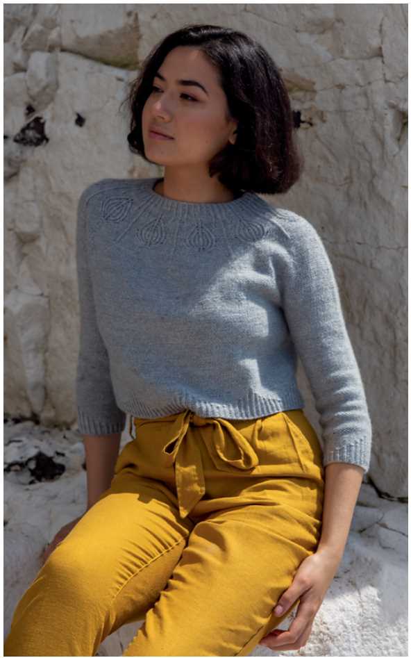 Укороченный вязаный свитер Astragal с круглой кокеткой выполняется без швов сверху вниз. Для изменения длины добавить 4.5 см перед началом нижней кромки. Рукав разработан длиной 3/4. Для удлинения рукава добавить ряды между рядами с убавками.