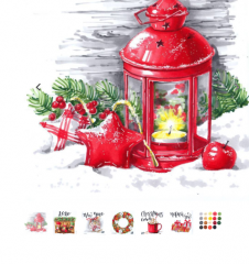 Изучаем рождественскую композицию со сложными элементами: фонарь, мягкие ёлочные игрушки, свеча, яблоко, еловые ветки.
