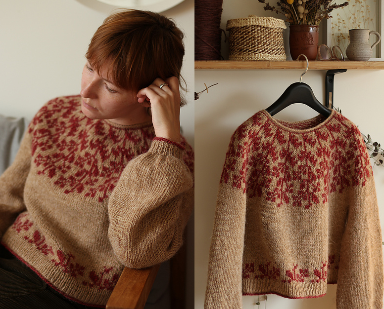 Этот романтичный укороченный пуловер с круглой кокеткой и и расширенными рукавами украшен цветочным цветочным узором, проходящим вокруг кокетки и по низу изделия.