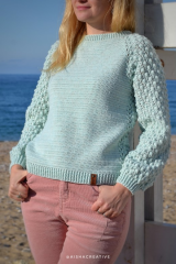 Нежный джемпер из полушерстяной пряжи, рукава связаны узором из мелких шишечек и линия реглана плавно переходит в боковую линию.