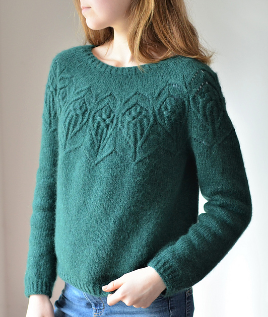 • Изделие вяжется одной деталью сверху вниз. В начале вы вяжете 7 рядов резинки горловины, затем с помощью укороченных рядов вывязывается углубление горловины (росток), и затем продолжается вязание по кругу. После круглой кокетки рукава отделяются от тела и далее вяжется по отдельности тело и затем рукава.