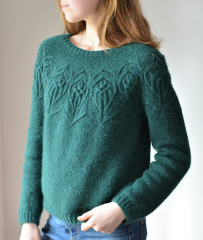 “Luftmeer” означает на немецком «воздушное пространство». Так я решила назвать этот свитер, поскольку узор на круглой кокетке напоминает мне монтгольфьеры, парящие в воздухе. Luftmeer – это бесшовный свитер, связанный сверху вниз с интересным узором на кокетке, в то время как всё остальное вяжется простой лицевой гладью. На фотографии представлен S.