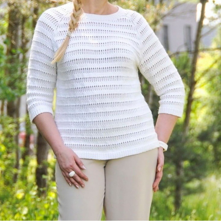 Пряжа: стоковая пряжа Coco cotton, 100% хлопок, 300 м в 100 гр., Около 355 (385, 415, 450, 485) гр. белого цвета; стоковая пряжа Millefili Carpi, 50% акрилан, 30% вискоза, 20% ангора, 2000 м в 100 гр., около 110 (115, 125, 135, 145) гр. белого цвета. Джемпер связан в 3 сложности: одна нить Коко хлопок и две нити Миллефили Карпи; окончательный метраж - 230 м / 100 гр. Для джемпера понадобится всего 1075 (1150, 1250, 1350, 1450) м.