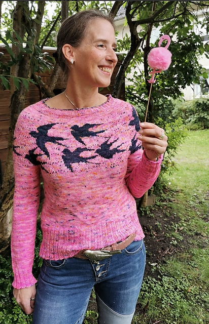 Я могу часами смотреть, как летают настоящие ласточки. К сожалению, они улетают на юг, когда заканчивается лето. С этим пуловером я могу взять лето с его ласточками в осень, чтобы дать мне крылья. Хорошая посадка пуловера гарантируется двумя секциями укороченных рядов. Одна для формирования ростка и вторая в области поясницы. Таким образом, спинка немного длиннее переда и очень подходит для ношения ремня. Различные размеры имеют различное количество ласточек на схемах. Таким образом, почти для каждого размера индивидуальная кокетка.