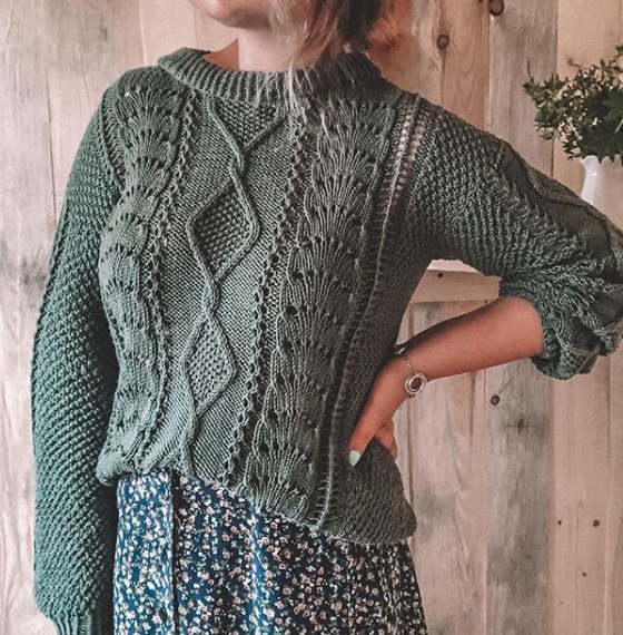Конструкция: Вяжется снизу вверх единым полотном по кругу до пройм, далее вязание делится на 2 части: спинка и перед, которые вяжутся по отдельности, и сшиваются плечевым швом. Рукава вяжутся сверху вниз из проймы.