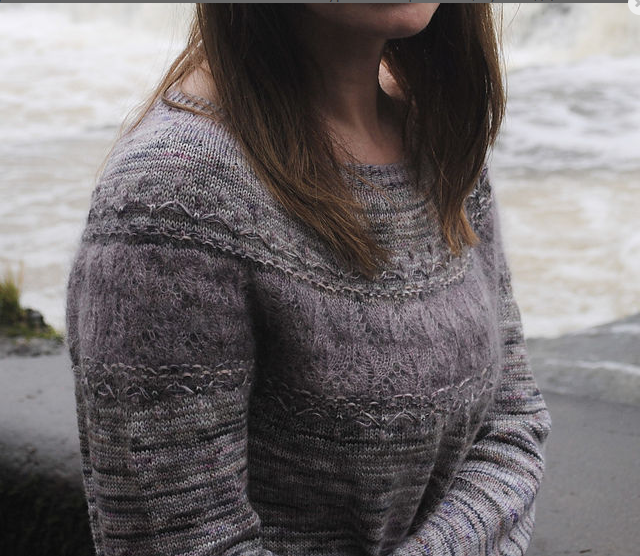 Самая центральная полоса кокетки двухслойная и состоит из наложенного тонкого ажура из мохера на лицевую гладь, окаймленная сверху и снизу затейливыми рельефными деталями, отражающими бурлящие пенящиеся волны, разбивающиеся о береговую линию.