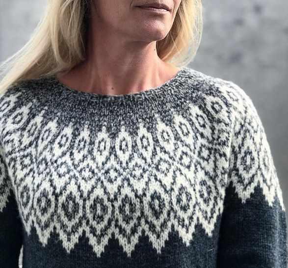 Сначала выполняется круглая кокетка с жаккардовым узором, затем джемпер вяжется лицевой гладью вниз.