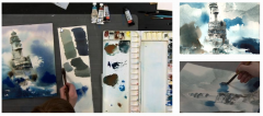 Облака, волны, отражение в воде и как сопоставление этому движимому - монолит камней и маяка. Такую композицию вы сможете изобразить вместе с художником Анной Чепурной . Работа ведется по сырой бумаге акварелью, с последующей детализацией по подсыхающей поверхности. В картине используются почти монохромные цвета.
