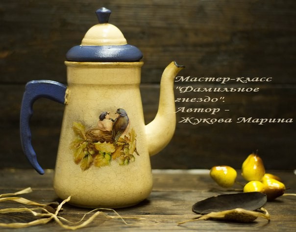 На мастер-классе будет подарена вторая, еще более прекрасная, жизнь, старому металлическому кофейнику. Кофейник будет декорирован в технике художественный декупаж, с необычной подрисовкой и двухшаговым кракелюром.