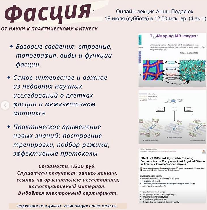 Приглашаю заинтересованных в повышении квалификации специалистов на свою онлайн-лекцию 'Фасция: от науки к практическому фитнесу'.