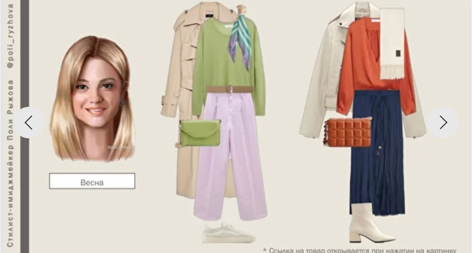 • Примеры образов, составленные с учетом разных цветотипов внешности и типов фигур + ссылка на каждую вещь