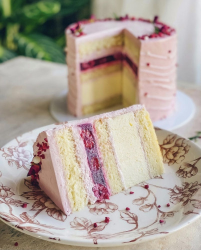 Внутри влажный шифоновый бисквит, чизкейк с халвой и тонким ароматом апельсина, малиновое компоте с розмарином и всё это укутано малиновым кремом.