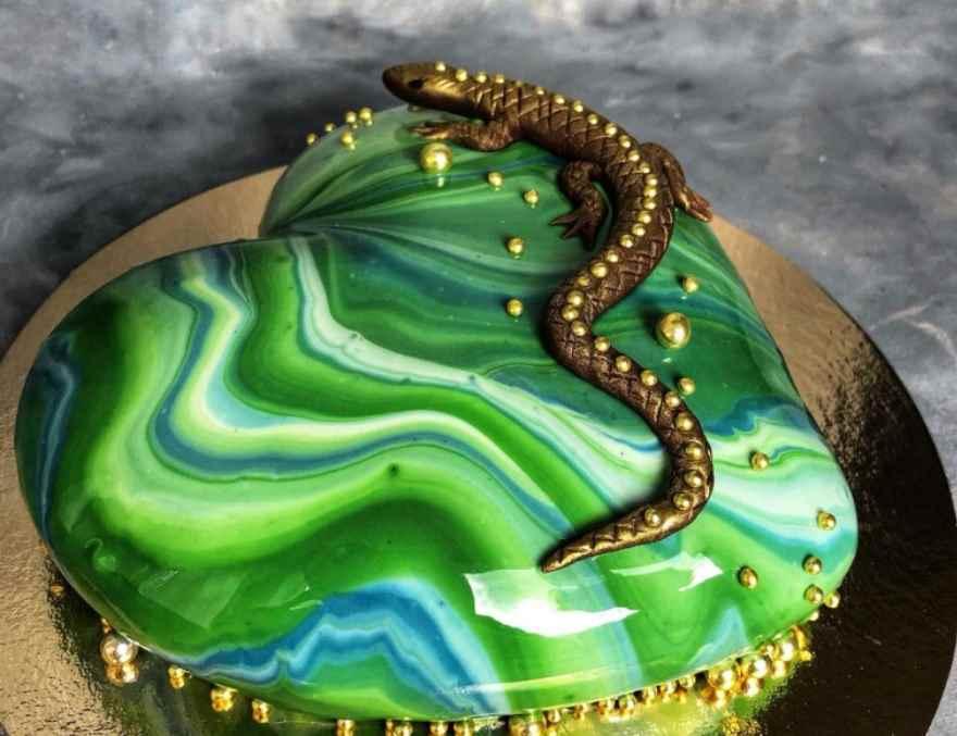 Сборка малахитового торта. На уже готовую основу мастер художественно наносит зеркальную глазурь и завершает оформление композиции ящерицей из пластичного шоколада. От такой профессиональной работы глаз не оторвать!