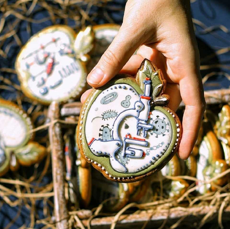 На этом этапе предстоит тонкая работа — нанесение на пряники росписи, посвящённой разным школьным предметам (математике, физкультуре, географии, литературе, химии и физике, биологии, английскому языку, истории, музыке).