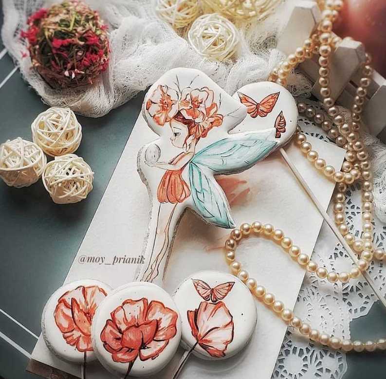 Для тех, кто хочет разобрать свои ошибки и научиться рисовать на пряниках милую фею и цветы, мы представляем мастер-класс от Алёны Долгих. В нём учитель рассказывает обо всех тонкостях росписи пряников и даёт чёткую инструкцию по изготовлению набора «Фея и маки».