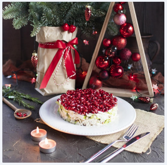 - Салат с печеным цыпленком, зернами граната и грецким орехом;