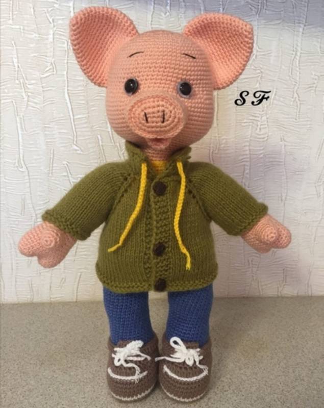 Мастер класс в PDF формате на 21 стр. содержит 47 фотографий и подробное описание процесса вязания крючком Хрюши, а так же вязание спицами свитер. Рост 30 см