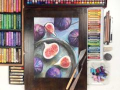В этом уроке мы создадим натюрморт в холодных тонах: напишем лилово-фиолетовые спелые плоды фигового дерева, поверхность кухонного стола голубого цвета и тяжелую керамическую тарелку. Вы впишете эту композицию в вертикальный формат и узнаете, как гармонично разместить все объекты на листе. После того, как вы перейдете к работе с цветом, Ника Сабрекова научит вас не только подбирать подходящие оттенки, но и «лепить» объем и форму с помощью светотени. Помимо работы с цветом, вы научитесь реалистично показывать разнообразные фактуры: матовую шкурку инжира, его сочную мякоть, грубоватую керамику и шероховатую поверхность дощатого стола.