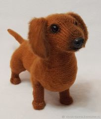 Такса на каркасе, цельновязанная - все складочки (на спинке, лапках) получены в процессе вязания, мордочка, глазницы, ротик связаны одним полотном, пришиваются только ушки.