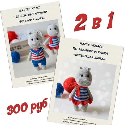 - состоят из 21 страницы пошагового описания вязания, оформления и сборки бегемотиков;