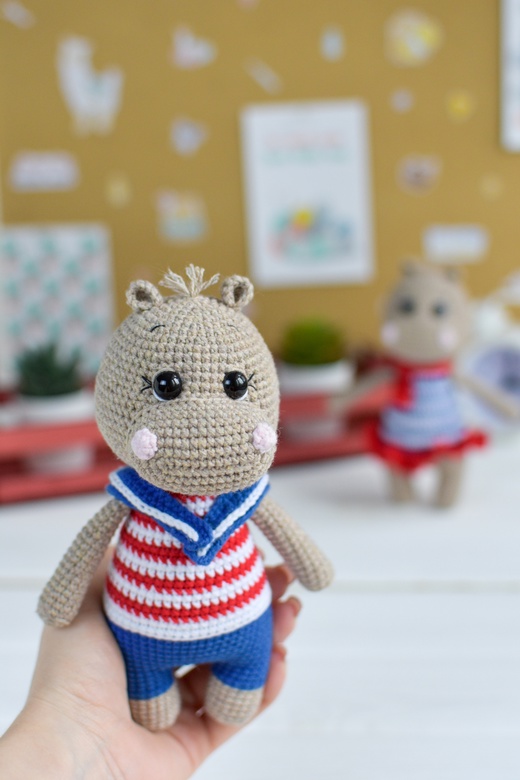 - состоит из 21 страницы пошагового описания вязания, оформления и сборки бегемотика;