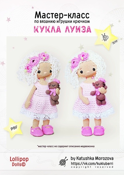 Включает в себя описания вязания тела куклы, одежды (пляатье, туфли, цветочная повязка), вышивки лица, крепление волос.