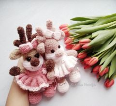 Пряжа DOLPHIN BABY HIMALAYA основной цвет - бежевый (80317) (у меня ушло 65 г., т.е., по идеи, одного моточка должно хватить на 3 игрушечки). Очень красивый жемчужный цвет/крем-брюле 80342. Думаю, что тоже подойдет и будет смотреться красиво. Можно Dolce YarnArt (747). Или Alize Softy (617, вязала в две нити).