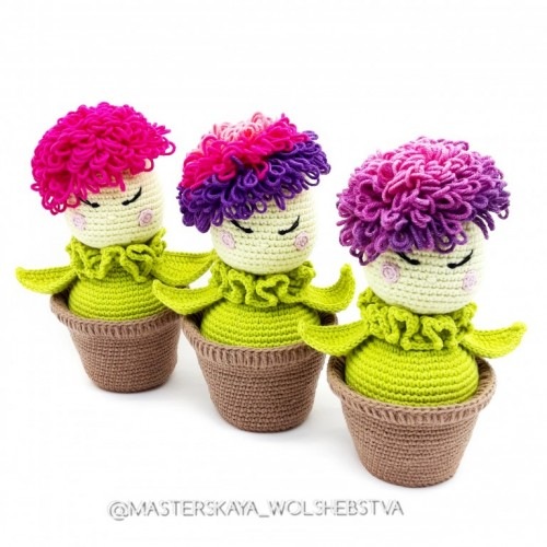 Мастер-класс в формате PDF содержит описание вязания игрушечного интерактивного цветка крючком, а также рекомендации по сборке, оформлению. Описание подкреплено 101 фотографией, видео по вязанию шляпки, оборки, основным моментам вязания листика и горшочка. У этого забавного цветочка снимаются и выгибаются листики, цветочек можно доставать из горшка и садить.