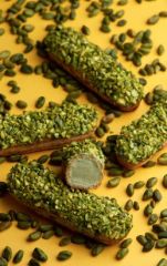 Декор полностью отражает вкус эклера, украшение из рубленых зеленых иранских фисташек делает изделие очень ярким.