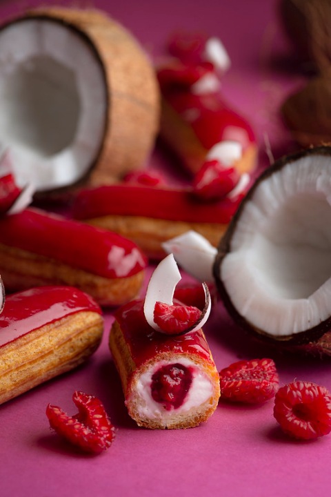 Этот эклер имеет классическое заварное тесто, а для начинки мы используем взбитую ганашу на основе белого шоколада и кокосового пюре, а также малиновый конфит. Мы покроем эклер ягодной глазурью без окраски.
