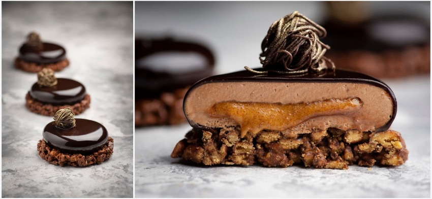 Реконструированное песочное тесто, покрытое черным шоколадом, фундучно-миндальное пралине, мусс из молочного шоколада с имбирем и займом, глазурь с какао и сливками, шоколадный декор