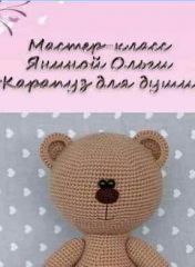 'Карапуз для души' - формат PDF, 82 страницы, 47 фотографий, 58,9 МБ. Включает в себя описание вязания тела мишки размером 32-34 см по рядам, сборка, оформление мордочки.
