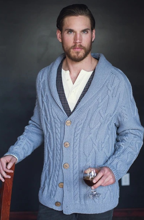 41? (47, 51?, 57)”/106 (119.5, 131.5, 145) cm chest circumference, buttoned. Cardigan shown measures 47”/119.5 cm.
